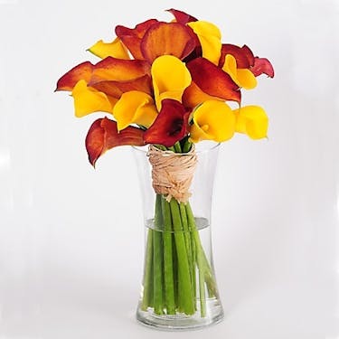 These Autumn colored calla lilies are an explosion of color that will bring warmth and cheer into the already intensely brilliant autumn months! Mango calla lilies make a fiery display of seasonal beauty, seated in a clear glass vase, to create a stunning, sophisticated bouquet that will have them dancing in the aisles.