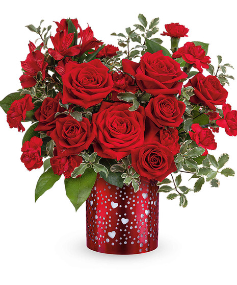 Let your love shine with our I Heart You Bouquet, featuring a passionate mix of red roses, alstroemeria, and carnations arranged in a red metal lantern adorned with charming heart and dot cutouts-a heartfelt Valentine's Day keepsake.