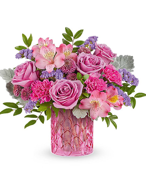 Celebrate her in style with Bosland's Pink Rhapsody Bouquet, a vibrant mix of pink and lavender blooms beautifully arranged in our Pink Rhapsody Vase. This stunning Mother's Day gift adds bold color and lasting charm to any space. Our Pink Rhapsody Bouquet is a vibrant Mother's Day flower arrangement featuring lavender roses, pink alstroemeria, fuchsia carnations, purple button spray chrysanthemums, and lavender sinuata statice, accented with dusty miller and huckleberry.