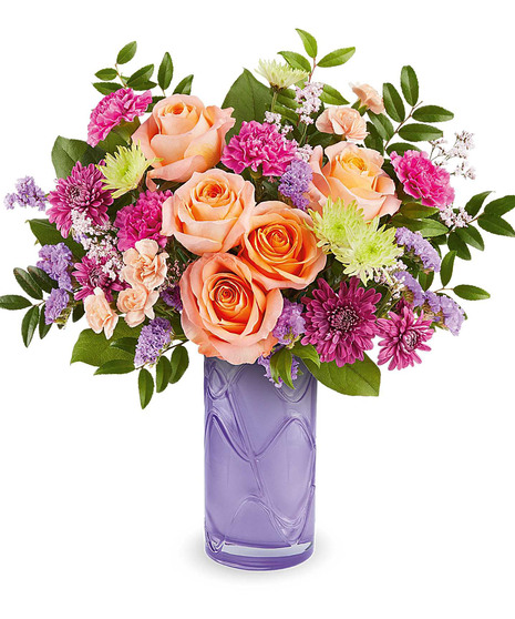 Celebrate her sweetest moments with our Pretty Daydream Bouquet, a dreamy mix of soft, vibrant blooms beautifully arranged in our Pretty Daydream Vase-a charming keepsake she'll enjoy long after Mother's Day. Bosland's Pretty Daydream Bouquet features peach roses, fuchsia carnations, miniature peach carnations, green and purple cushion spray chrysanthemums, purple sinuata statice, and pink limonium, accented with huckleberry and salal, delivered in our Pretty Daydream Vase.
