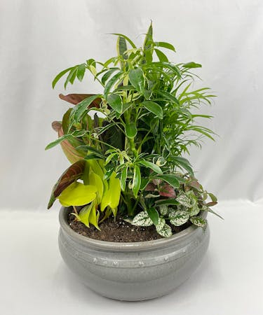 This ceramic dish garden full of beautiful plants makes anything but a small impression on whomever receives it. Perfect for home or office. Planted ceramic containers, colors will vary.