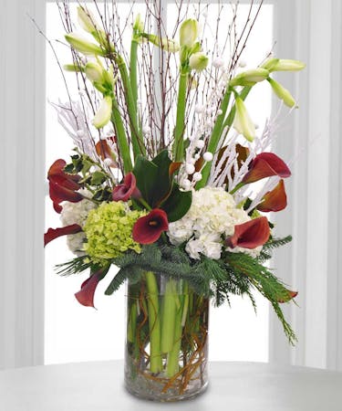 This elegant design of winter amaryllis, calla lilies, hydrangea captures the spirit of the holiday and provides a breathtaking display of hydrangea, calla lilies, amaryllis and holiday accents.