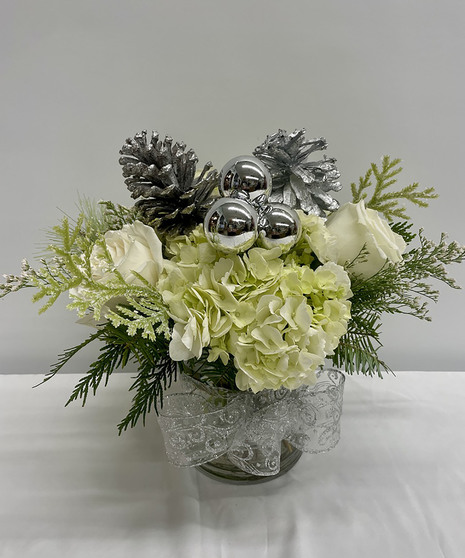 Frosted with silver sparkles, silver Christmas balls, silver glittered pinecones this arrangement includes white hydrangeas, puffs of babies breathe and white roses.