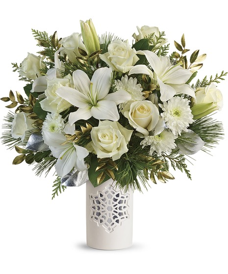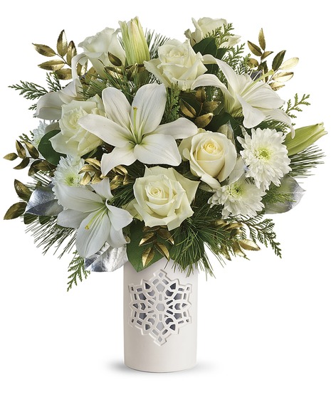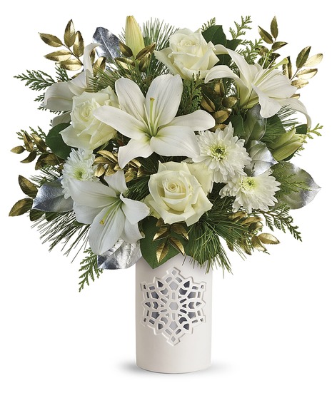 Inspired the snowfall, this elegant of white roses and lilies is perfectly presented in a pretty porcelain vase with delicate punched snowflakes. Doubles as a delightful winter votive!